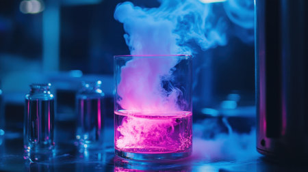 Colorful chemical reaction frozen mid-process in beaker with steam and bubbling liquid