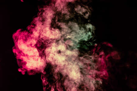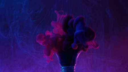Neon smoke background. Paint water mix. Creative idea. Blue pink color ink splash in broken light bulb on purple floating mist abstract art texture.