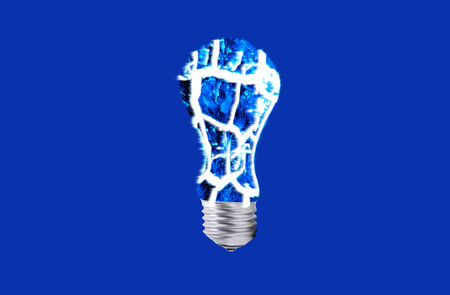 Incandescent light bulb on wooden floor with blue neon light.