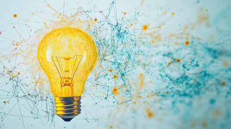 Abstract drawing featuring a yellow light bulb symbolizing the flow of ideas on a white background