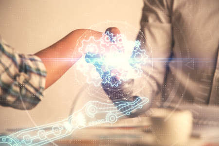 Double exposure of brain drawing over us dollars bill background. Technology concept.