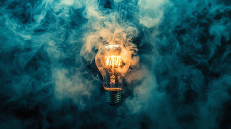 An illuminated light bulb surrounded by swirling blue smoke creates a captivating atmosphere. The image symbolizes creativity and inspiration, perfect for design projects.