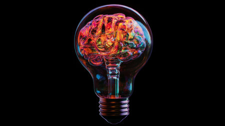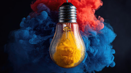 A light bulb is the central subject, filled with yellow substance, against a backdrop of red and blue smoke. The composition presents an artistic and energetic visual, with soft lighting and a dark background. This image is suited for illustrating concepts of innovation, ideas, and creative processes, perfect for commercial use.