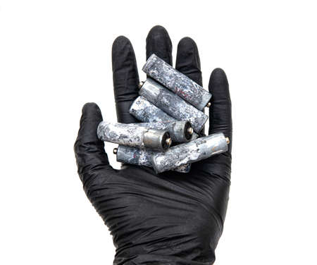 Close-up of a human hand in black nitrile glove holding a bunch of heavily corroded AA type batteries isolated on white background.