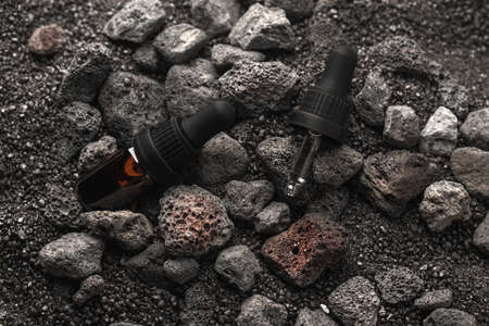 Essential oil for aromatherapy and mineral diffuser with volcanic stones on black sand background. Aromatherapy, spa, beauty treatment and wellness concept.