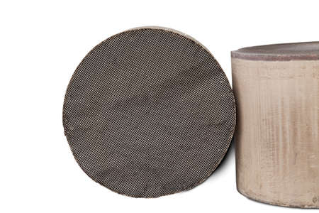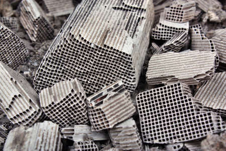 Recycle and purchase of precious non-ferrous metals. Close up on in the cut parts of broken ceramic catalysts containing platinum, palladium and rhodium on a white background.