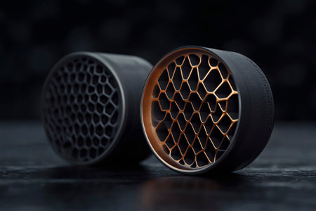 Two cylindrical objects with complex, contrasting metal lattice designs. Close-up view.