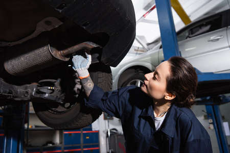 Young mechanic in glove standing near vehicle silencer in service