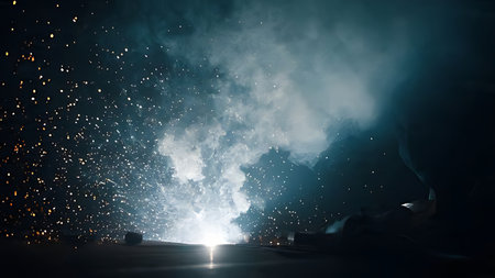 Welding spark shower with volumetric smoke. Low angle view of molten metal texture and manufacturing.