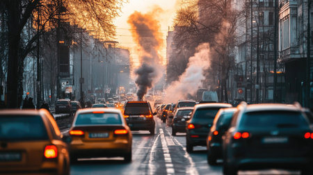 Hazy smoke trails from a car exhaust, blending into a dense cityscape, showing vehicle emissions as part of urban pollution