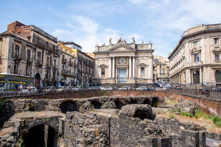 Part of the roman amphitheater, in Piazza Estesicoro, Catania, Sicily, Italy - May 25 2017