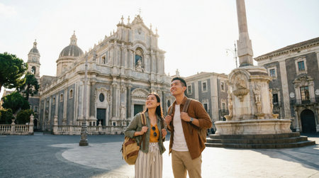 Two Asian tourists stand together in front of a historic building in Sicily. They look up and smile while exploring the area. The sun shines brightly as they enjoy their trip.