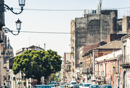 Beautiful cityscape of Italy, historical street of Catania, Sicily, facade of old buildings