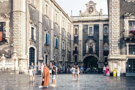Catania, Sicily, Italy – august 15, 2018: people on the historical square of the city, Piazza del Duomo near Cathedral dedicated to Santa Agatha