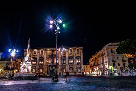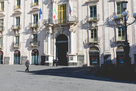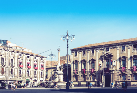 Piazza Duomo or Cathedral Square with Town Hall building in Catania, Renaissance architecture in Sicily, Italy.