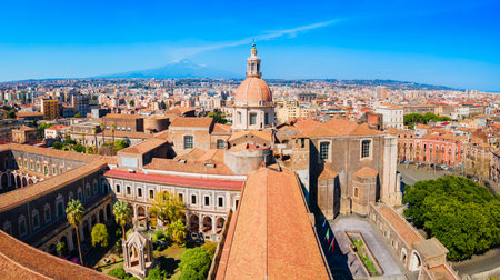 Benedictine Monastery and church of San Nicolo or Saint Nicholas Arena aerial panoramic view in Catania. Catania is the second largest city in Sicily, Italy.