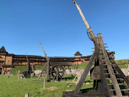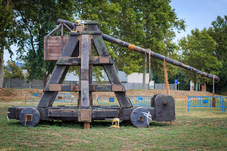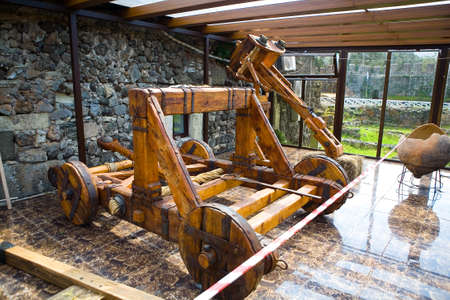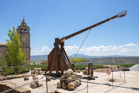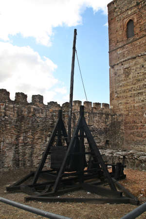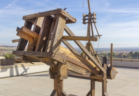 Recreation of medieval catapult behind the walls of Buitrago de Lozoya, Madrid, Spain.