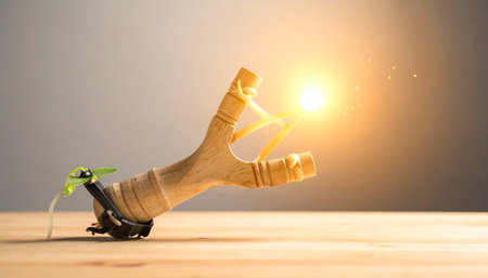 Close up man playing slingshot or catapult in morning time with sunlight effect