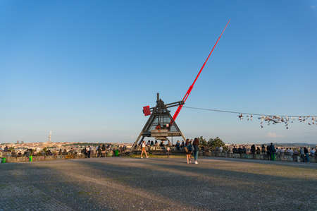 PRAGUE, CZECH REPUBLIC, APRIL 2020 - Prague giant metronome or pendulum installed on the site of the monument to the Soviet dictator Stalin The process of de-Stalinization. Famous skteboarding place.