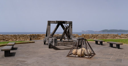 ancient catapult on the ramparts of Alghero ,Sardinia Island, Italy , Defensive wall. Catapult in the downtown of the citywith the sea as background and the big stone bullets in front