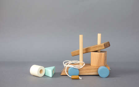 Children's wooden ecological toys of different geometric shapes. Car, twine on a gray background.