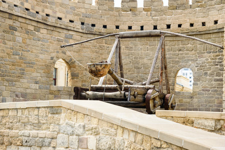 Baku, Azerbaijan - September 10, 2016: Ancient medieval catapult at tower of fortress in Old City, Icheri Shehe is the historical core of Baku. World Heritage Site by UNESCO