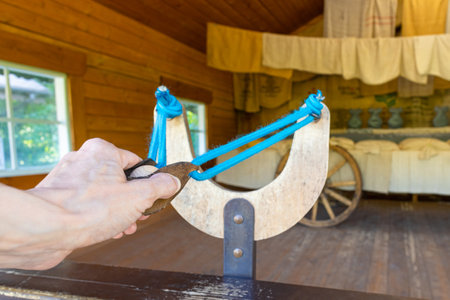 Man hand take stone with slingshot small hand-powered projectile weapon on wooden background. Classic form Y-shaped frame held in off hand with two rubber strips. Pocket that holds projectile