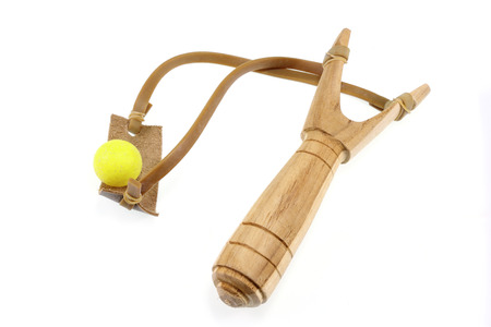 Handmade slingshot catapult. Y-shaped wooden stick with elastic tied between two top parts. Slingshot or Catapult is device for shooting small stones.