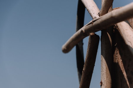 Wooden fortress wall against the sky. Medieval fortress with high walls. Wooden installation in the style of an ancient city. Kiev region, Obukhov district, village Kopachevo, May 10, 2021.