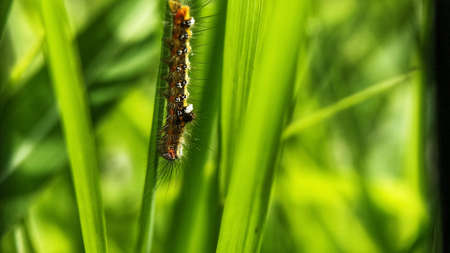 Hairy caterpillar close-up on the grass.