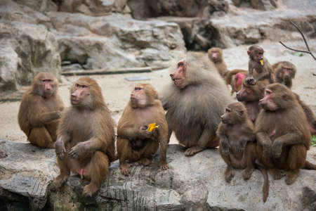 Family of Hamadryas Baboon in a cave in a park in Singapore. Baboons busy eating and playing with each other