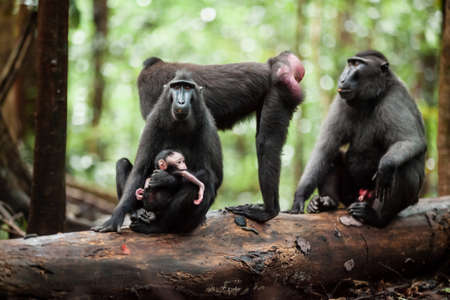A group of Crested black macaques having a leisure time in the jungle of Sulawesi island, Indonesia