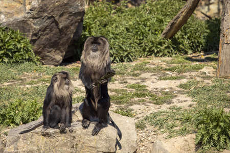 View of two monkeys in the park sitting on stones. (Macaca silenus)