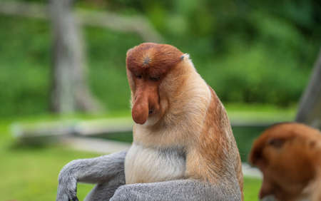 Family of wild Proboscis monkey or Nasalis larvatus, in the rainforest of island Borneo, Malaysia, close up. Amazing monkey with a big nose.