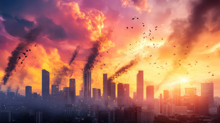 Pollution-filled sky with heavy particles drifting over city buildings, creating a dramatic, somber skyline