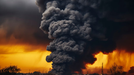 Thick Black Smoke Veils the Sky, Marking the Turmoil of War Below. Generative AI