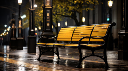 a yellow bench sitting on a wet sidewalk at night