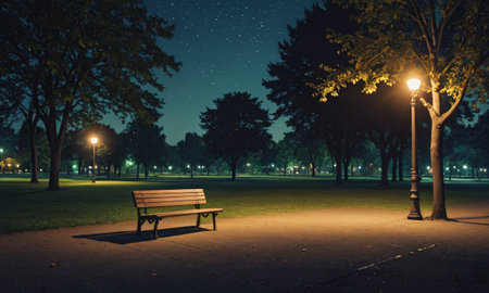 A serene night scene in a park featuring a lit lamp post and a wooden bench, with the warm glow of the light illuminating the foreground and creating a peaceful, contemplative atmosphere.