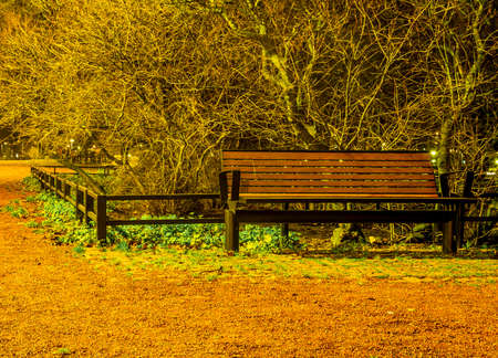 City park at night. Empty bench and promenade.