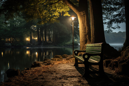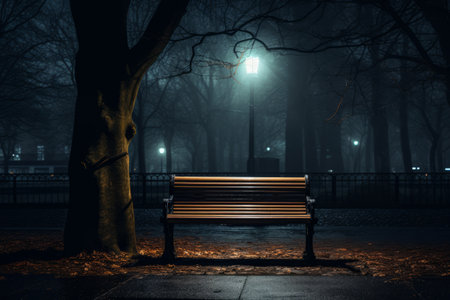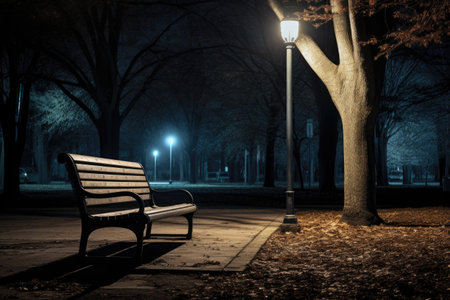 empty park bench under a single illuminated lamp, created with generative ai