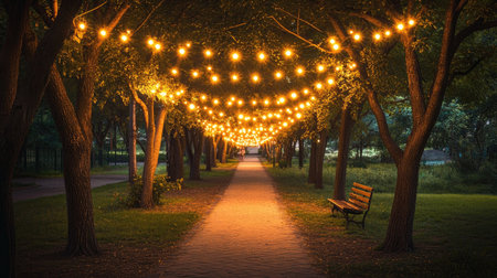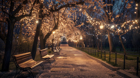 A picturesque park pathway illuminated by fairy lights strung between trees, inviting couples for romantic evening strolls in a beautiful natural setting.