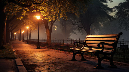 Bench in the park at night with lanterns and fog in the background