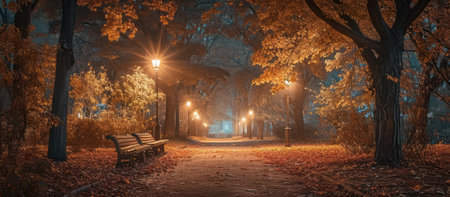 Park in autumn at night with trees, benches and lanterns.