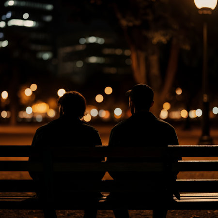 Silhouette of two men sitting on a bench in the city at night