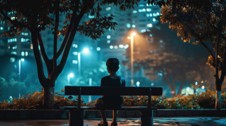 A boy sitting on a city bench at night, his figure illuminated by a nearby streetlamp, feeling lost