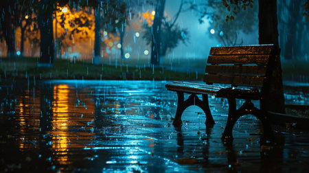 Lonely bench in the rain at night in the park.