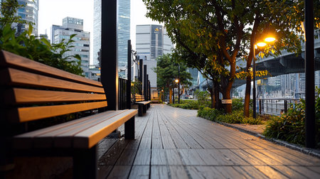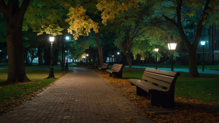 A serene park scene featuring wooden benches along a path, illuminated by warm streetlights, with modern city buildings in the background, creating a peaceful urban retreat.
