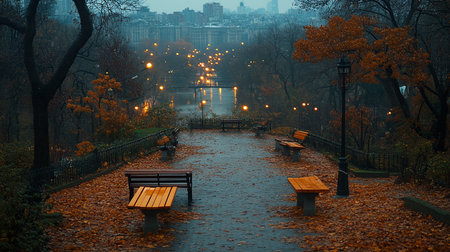 A tranquil park scene with benches covered in autumn leaves, overlooking a river and city lights on a misty evening, creating a serene and atmospheric landscape.