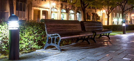 Wooden benches in a pedestrian rest area with floor lamps in Old Montreal at night.