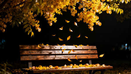 Wooden bench with yellow leaves in the park at night. Autumn background.